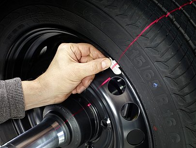 Über den langen Datenarm und das Außensonar werden Felge und Wuchtprogramm automatisch bestimmt. Die elektronische Bremse stoppt das Rad in der exakten Korrekturposition und ein Punktlaser zeigt die genaue Platzierung für Klebegewichte an.