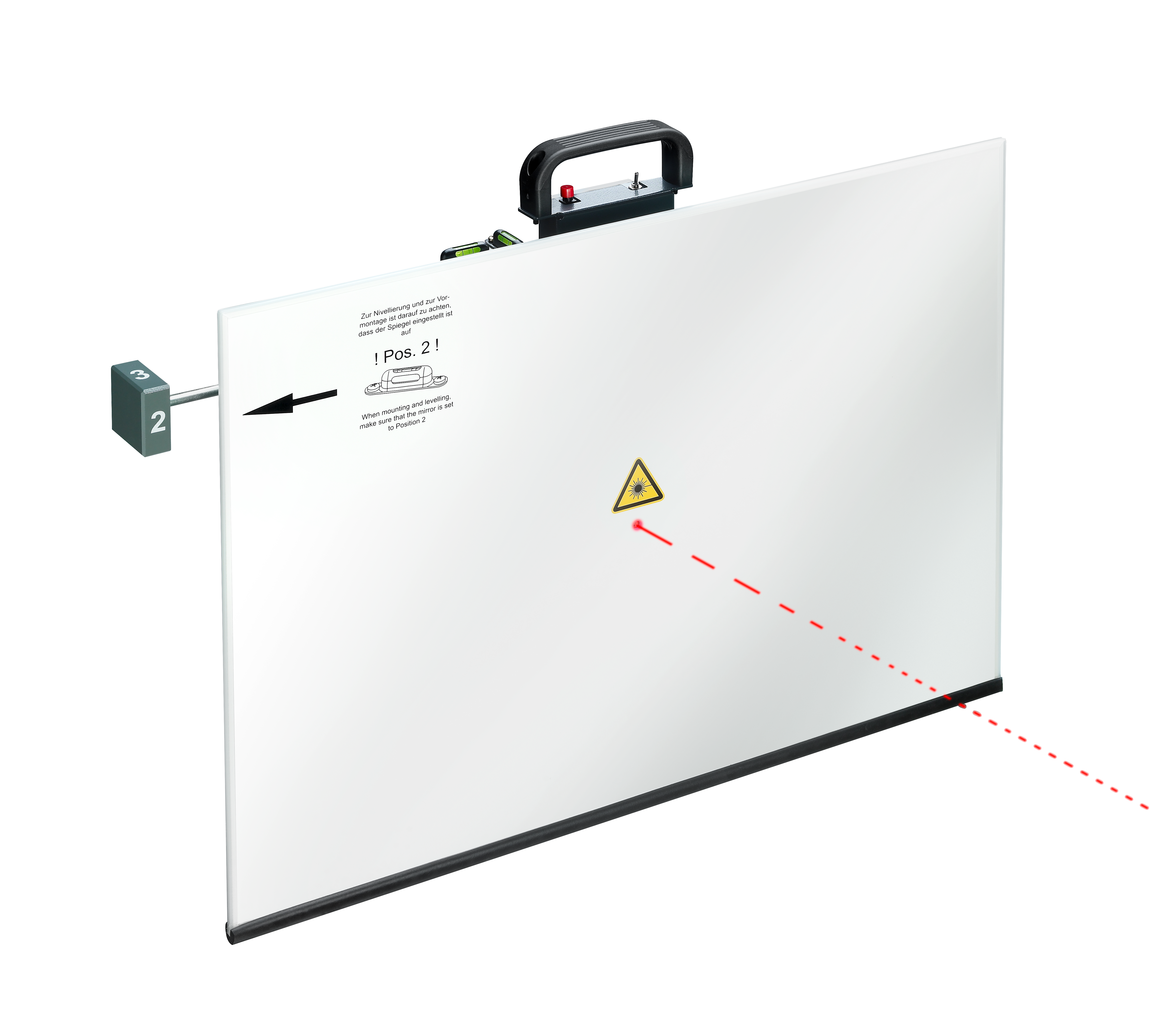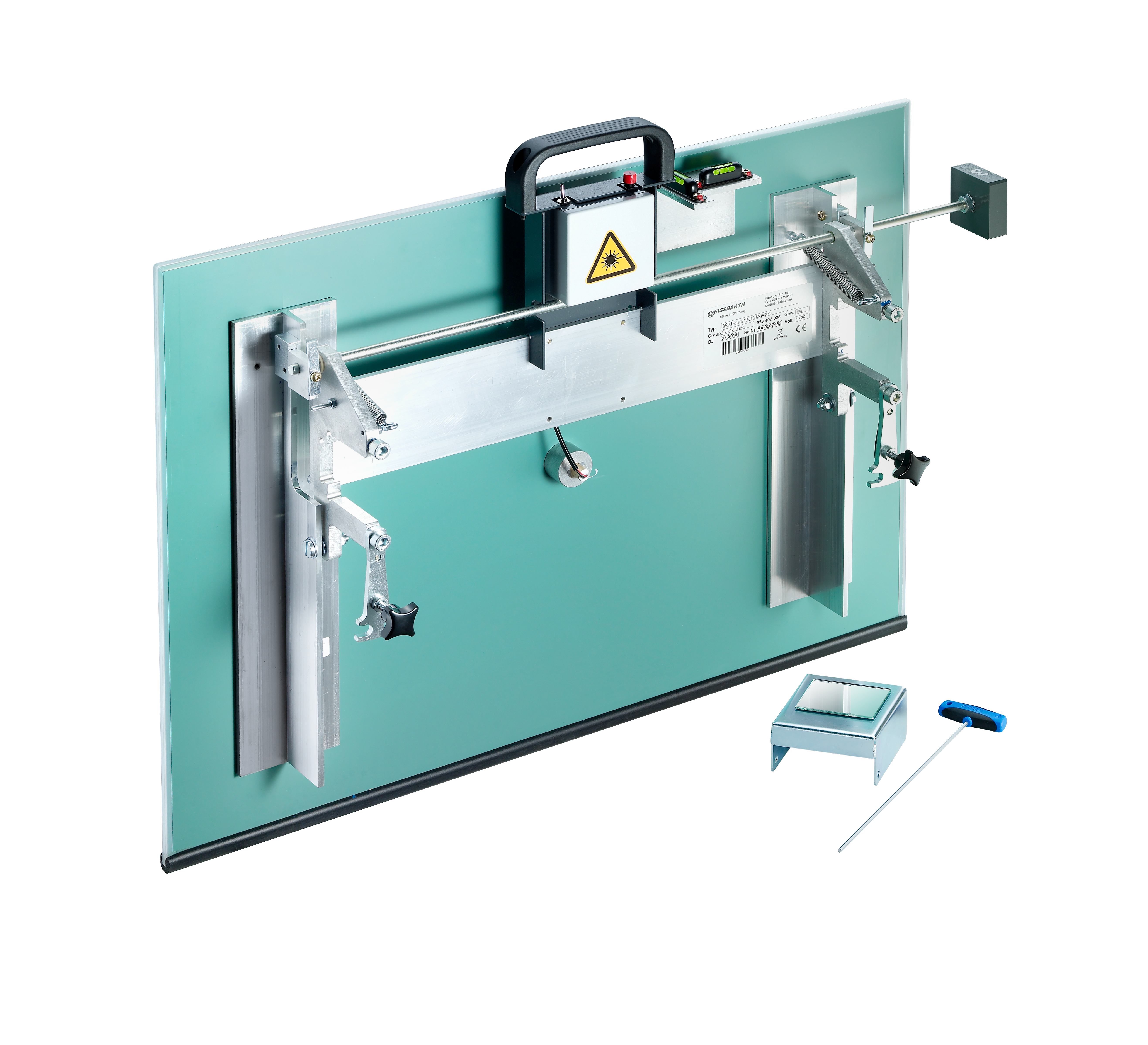 The ACC Reflective Mirror VAS 6430/3 is used for the adjustment of ACC sensors on Audi vehicles and is attached to the crossbar of the VAS 6430/1A base frame. Using an integrated laser, the 650x470 mm mirror can be aligned with the radar sensor and tilted into 3 different pitch angles via an adjustment screw. The actual software calibration is performed using the diagnostic tester.