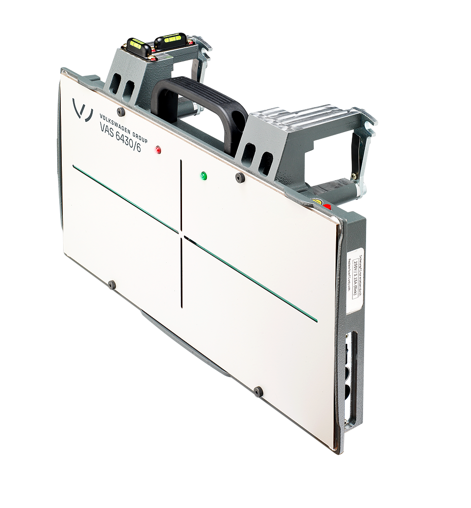 The VAS 6430/6 calibration adapter is used to calibrate the Night Vision Assistant and is mounted on the crossbar of the VAS 6430/1A base frame. The VAS 6430/6 is positioned in the center of the direction of travel using a wheel aligner and serves as a reference heat source for the thermal imaging camera, which can be recalibrated under the guidance of a diagnostic device.