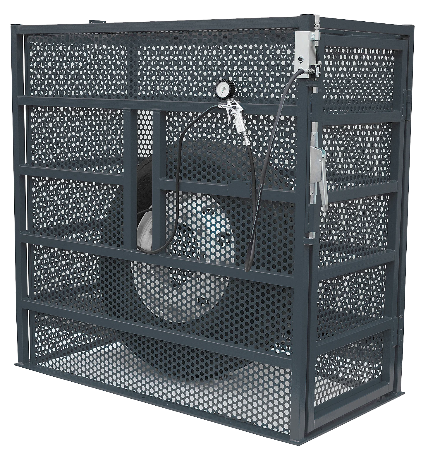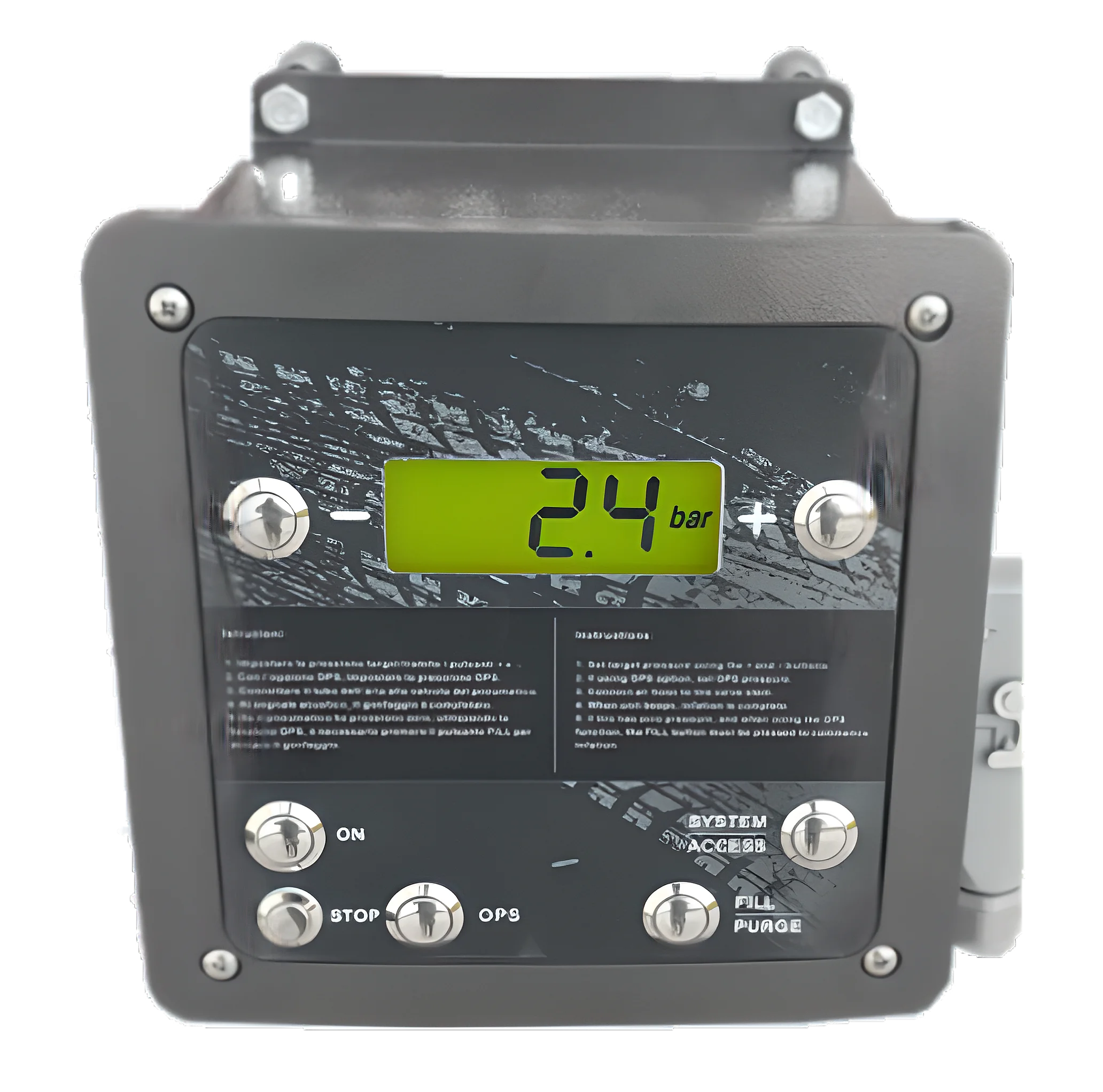 Auf Anfrage kann der Reifenfüllkäfig mit einem Befüll-Computer für die selbsttätige Reifenbefüllung ausgestattet werden. Nach Auswahl des notwendigen Drucks und erfolgtem Startbefehl führt der Befüll-Computer den Aufpumpvorgang automatisch zu Ende, so dass der Mitarbeiter in der Zwischenzeit andere Arbeiten verrichten kann. Maximal zulässiger Fülldruck: 10bar