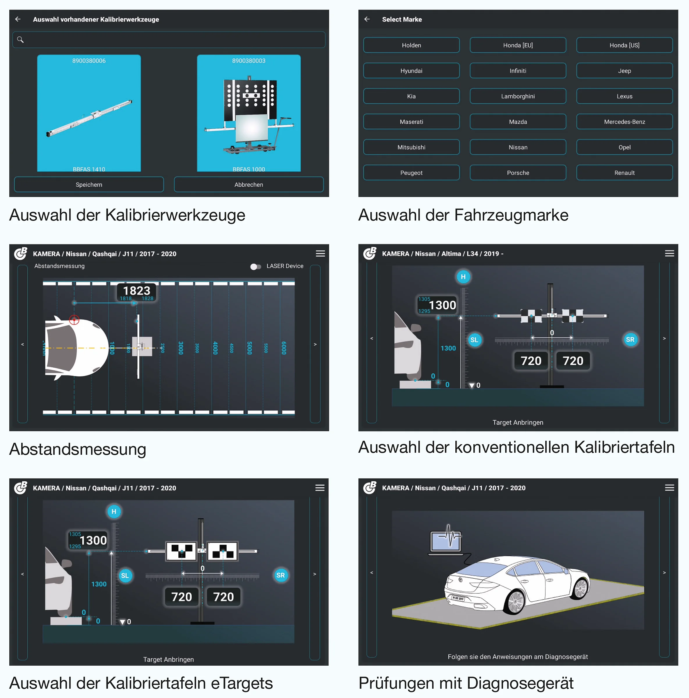 - Schritt-für-Schritt-Anweisungen zur korrekten Positionierung der ADAS-Vorrichtung und der Kalibriertafeln