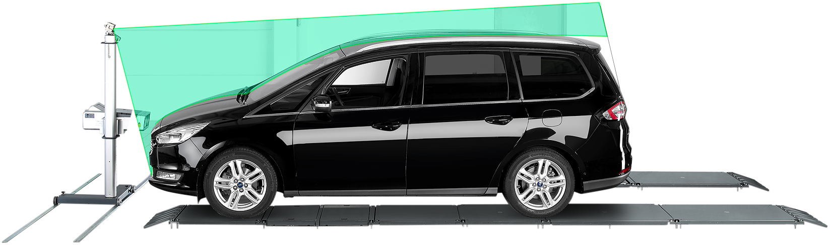 • Exakte Ausrichtung zur Fahrzeuglängsmittelebene: mit Laser-Modul und Ausrichtpendel am Fahrzeug-Heck